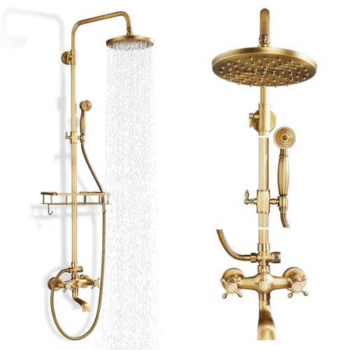 Gmusre Ensemble de robinet de douche en laiton antique – Pomme de douche à effet pluie de 20,3 cm avec douchette à poignée, bec cascade et douche extérieure murale avec étagère