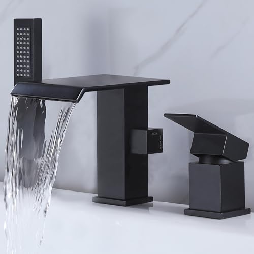 NIITAWH Robinet de baignoire romaine cascade avec douchette à main Noir mat Robinet de baignoire haut débit 3 trous Large Baignoire Montage sur pont Laiton massif