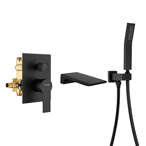 Airuida Robinet de baignoire mural avec bec cascade - Robinet de baignoire mural avec douche à main - Robinet de douche à poignée unique avec valve rugueuse - Bec droit - Noir mat