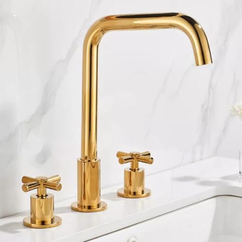 TPS 3 Trous pour Lavabo De Salle De Bain Robinets De Lavabo à Double Poignée Croisée Robinet De Lavabo De Salle De Bain en Laiton Robinet Mélangeur D’évier D’Eau Chaude Froide, Gold