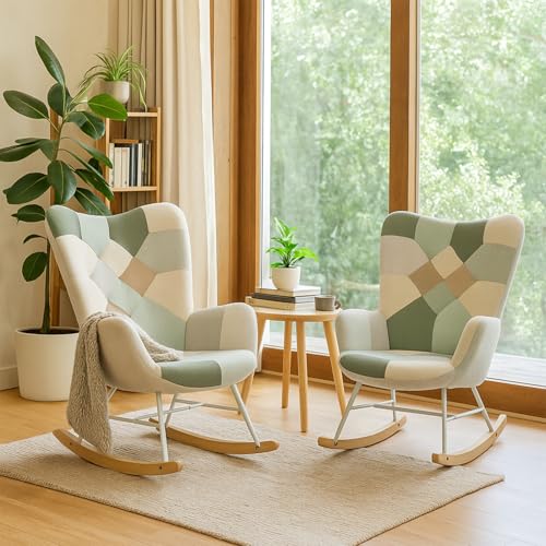 Meuble Cosy Lot de 2 Fauteuils à Bascule, Chaise de Relaxation, Rocking Chair Confortable pour Salon en Tissu Patchwork avec Pieds Bois et Métal