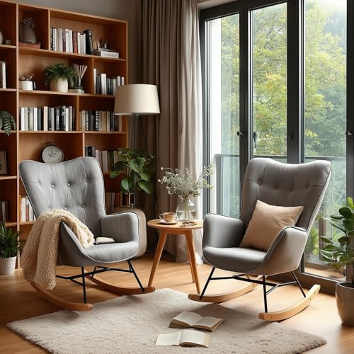 Meuble Cosy Lot de 2 Fauteuils à Bascule, Chaise de Relaxation, Rocking Chair Confortable pour Salon en Tissu avec Pieds Bois et Métal, Décor de Boutons