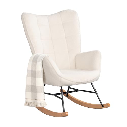 Clevich Fauteuil à Bascule Allaitement Scandinave, Rocking Chair Confortable avec Velours Teddy, Pieds en Bois et Métal, pour Salon, Chambre d'enfants, Chambre, Jusqu'à 136kg, Blanc