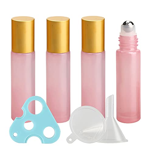 TIANZD Lot de 4, Flacons à Bille pour Huiles Essentielles 10ml – Bouteilles Roll-on en Verre Rose avec Couvercle Or avec Rouleau en Acier Inoxydable (1 décapsuleur et 1 entonnoir)