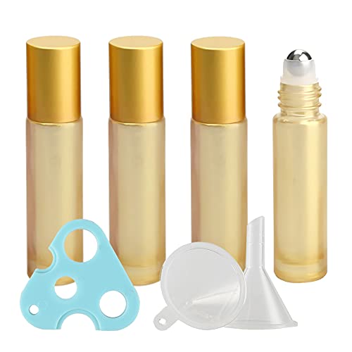 TIANZD Lot de 4, Flacons à Bille pour Huiles Essentielles 10ml – Bouteilles Roll-on en Verre Jaune avec Couvercle Or avec Rouleau en Acier Inoxydable (1 décapsuleur et 1 entonnoir)