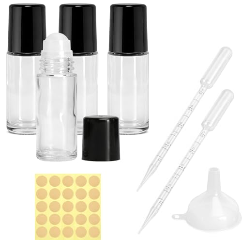 GZRXIOUS 30ml Lot de 4 Flacons Roll on Vides en Verre – Flacons Roll on pour Huiles Essentielles avec Bille, Rechargeables, avec Pipettes, Entonnoir et Autocollants pour Aromathérapie, Parfumet Huiles