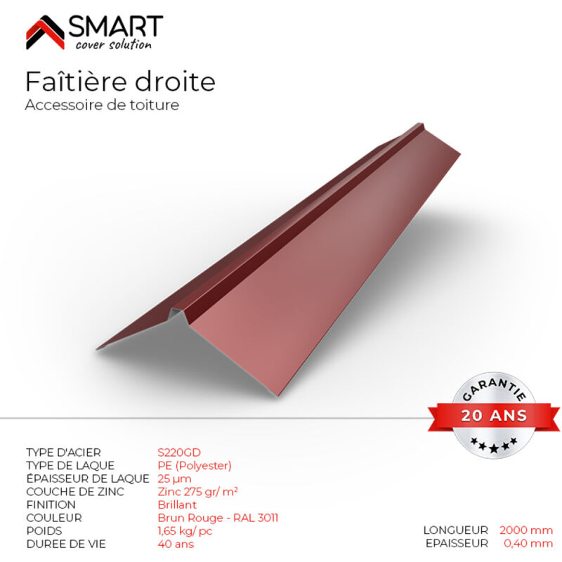 Bravo The Smart Solution - Faîtière droite - bac acier - tôle de couverture - Toiture - H12 Brun Rouge ral 3011 L=2m