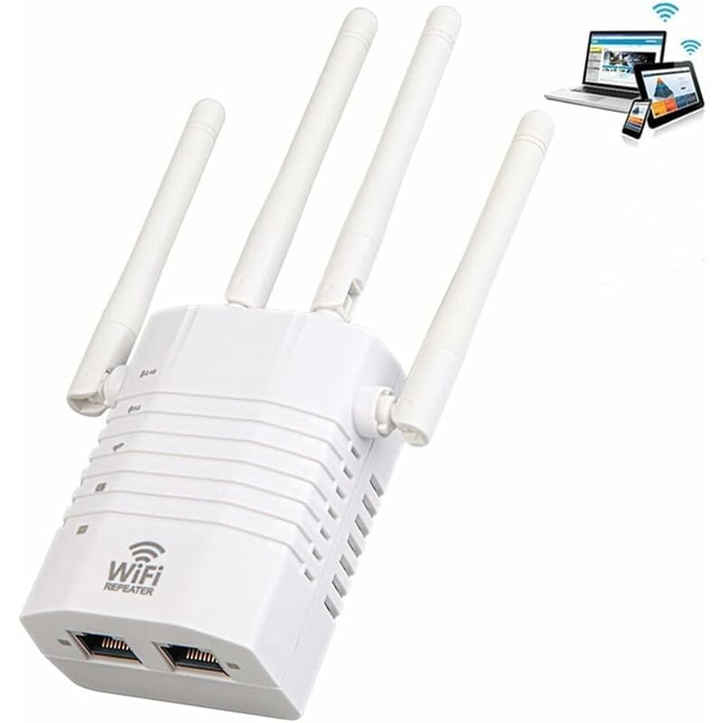 Repeteur WiFi Puissant 1200Mbps Double Bande (5GHz + 2.4GHz), Amplificateur WiFi avec 4 Antennes, Mode Répéteur/Routeur/AP, 2 Ports LAN, Compatible Toutes Box Internet, Intérieur/Extérieur