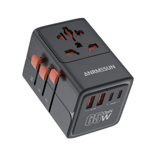 Adaptateur de voyage universel GaN 65 W avec 2 USB C et 2 USB A, charge rapide, adaptateur de prise international pour UE, Royaume-Uni, États-Unis, Japon, Thaïlande, Australie, noir