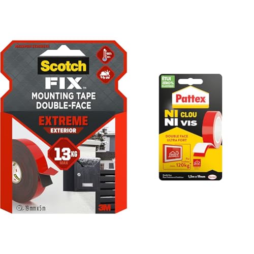 Scotch-Fix Ruban de fixation Extrême pour extérieur, 19mmx5m, 1 rouleau/paquet & Pattex Ni Clou Ni Vis | Ruban adhésif double face ultra fort (rouleau de 1,5 m x 19 mm)