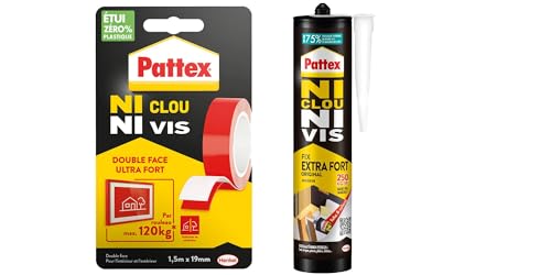 Pattex Ni Clou Ni Vis Double Face 19 mm x 1,5 m, Ruban adhésif double face ultra résistant & Ni Clou Ni Vis Extra Fort & Rapide, colle de fixation surpuissante, colle rapide, cartouche 380 g
