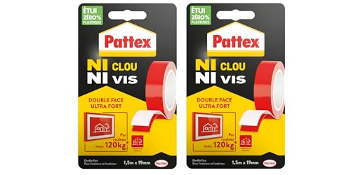 Pattex Ni Clou Ni Vis | Ruban adhésif double face ultra fort (rouleau de 1,5 m x 19 mm) – Adhésif de montage pour intérieur & extérieur – Maximum 120 kg par rouleau (Lot de 2)