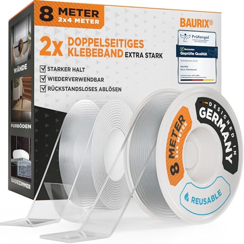 BAURIX® Ruban adhésif double face [2x 4m] - Adhésif double face extra fort - Double face transparent en silicone lavable - Scotch ultra résistant