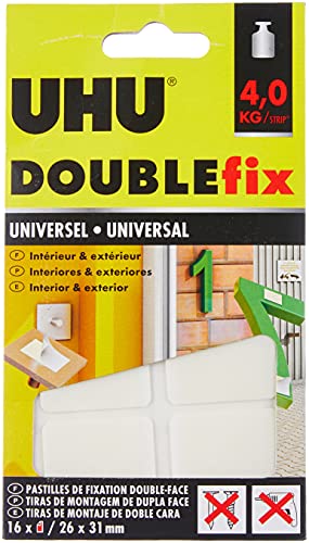 UHU Doublefix universel -Ruban adhésif double face, ultra fort, résistance à 4,0 Kg, blanc, 16 pastilles