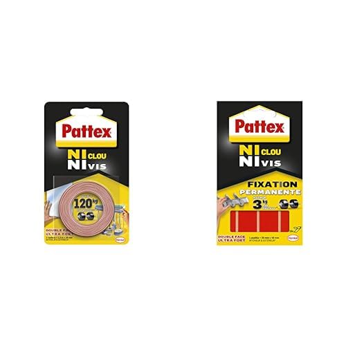 Pattex Ni Clou Ni Vis Double Face, Ruban adhésif double face ultra résistant, 19 mm x 1,5 m & Ni Clou Ni Vis Pastilles Fixation Permanente, Pastilles double faces ultra fortes, 10 pastilles