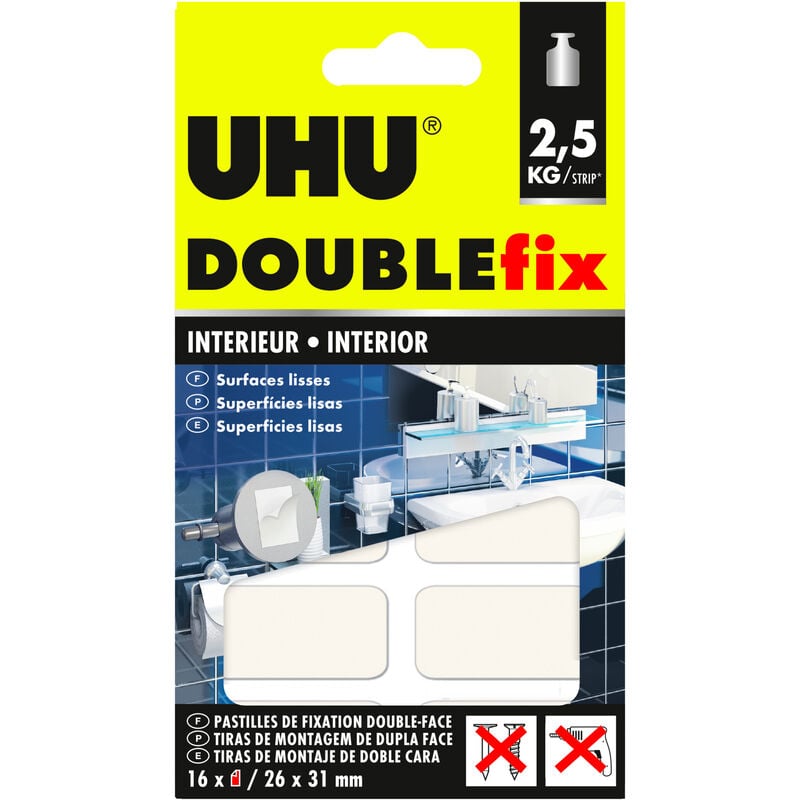 Doublefix intérieur extra fort - Ruban adhésif double face, ultra puissant, blanc, 16 pastilles - UHU