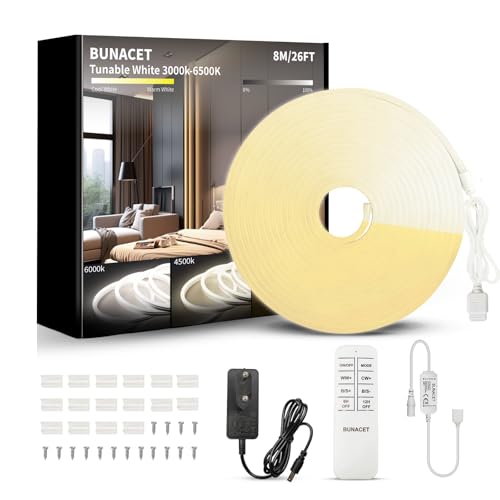 BUNACET Ruban LED Néon Etanche 8M 24V KIT, Bande Neon LED Luminaire Tunable Blanche Chaud Froid 3000K-6500K Dimmable avec Télécommande RF & Alimentation,120 LEDs/M,IP67 Exterieur pour Chambre Cuisine
