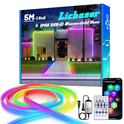 Lichaser 5M RVB+IC Ruban LED Neon Flexible, IP68 Bluetooth Ruban LED Exterieur Etanche avec Télécommande et Smart APP, 24V DIY Silikon Lampe Néon pour Balcon, Pavillon, Fête, Jardin