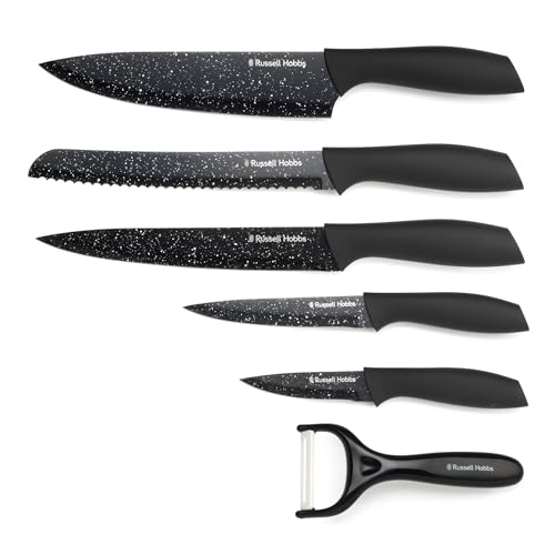 Russell Hobbs 6 pièces Ensemble de couteaux et éplucheur – Couteaux de chef/de pain/de découpe/d'utilité/de paring, lames avec effet marbré antiadhésif, lavage à la main, noir