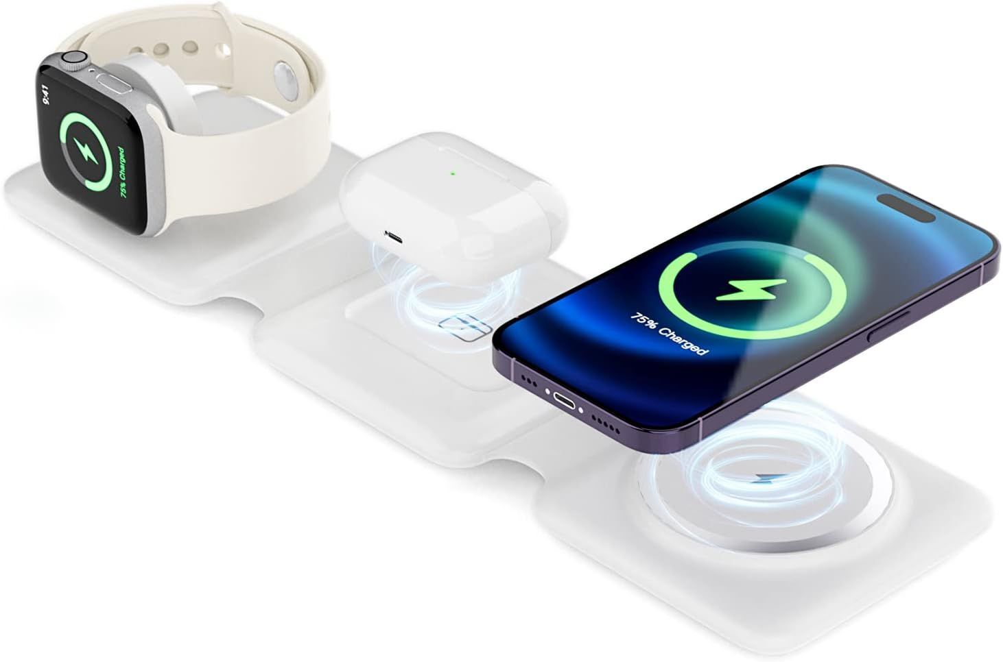 Station De Charge Magnétique Sans Fil 3 En 1 Avec Adaptateur Rapide 18w Pour Iphone 14/13/12 Series, Samsung Note/Mate/Pixel /S20/S21 Series, Airpods Pro/3/2, Apple Watch 2/3/4/5/Se/6/7/8-Blanc