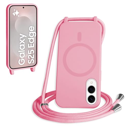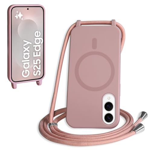 FMPCUON Magnétique Coque avec Cordon pour Samsung Galaxy S25 Edge, [Compatible avec MagSafe] Etui Collier Réglable Téléphone Étui Portable Lanyard Case Protection Complète Cover,Rose