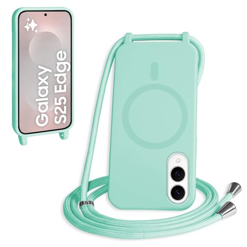 FMPCUON Magnétique Coque avec Cordon pour Samsung Galaxy S25 Edge, [Compatible avec MagSafe] Etui Collier Réglable Téléphone Étui Portable Lanyard Case Protection Complète Cover,Vert Clair
