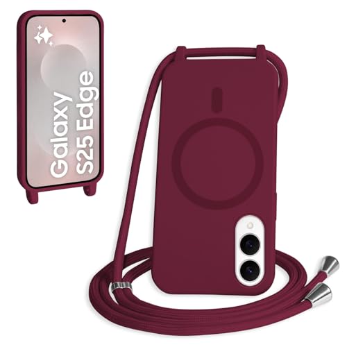 FMPCUON Magnétique Coque avec Cordon pour Samsung Galaxy S25 Edge, [Compatible avec MagSafe] Etui Collier Réglable Téléphone Étui Portable Lanyard Case Protection Complète Cover,Rouge