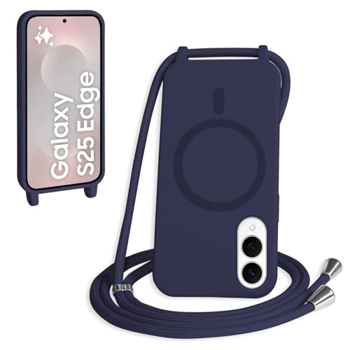 FMPCUON Magnétique Coque avec Cordon pour Samsung Galaxy S25 Edge, [Compatible avec MagSafe] Etui Collier Réglable Téléphone Étui Portable Lanyard Case Protection Complète Cover,Bleu