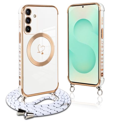 Pnakqil Coque Magnétique pour Samsung Galaxy S25 Plus Con Cordon, Compatible avec MagSafe, Silicone Housse avec Motif Coeur d'amour Réglable Collier Lanyard, Antichoc Etui pour Samsung S25+, Blanc