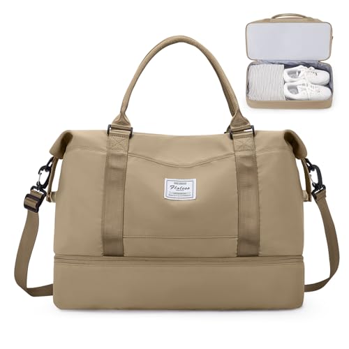 HPLQQ Sac de Voyage Femme, Bagage Cabine 45x36x20 Easyjet, Imperméable Sac fourre-Tout de Sport pour Week-End pour Travel Gym Danse avec Compartiment Chaussures,A01-Marron Beige