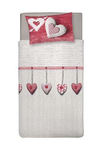 PENSIERI DELICATI Parure de lit Simple 100% Coton, avec Sac 155 x 200 cm et 1 taie d'oreiller 52 x 82 cm, fabriquée en Italie, Housse de Couette Lavable en Machine à 40 °, Motif cœur Suspendu Rouge