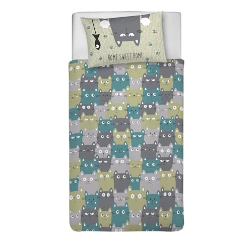 PENSIERI DELICATI Parure de lit Simple 100% Coton, avec Sac 150 x 200 cm et 1 taie d'oreiller 52 x 82 cm, fabriquée en Italie, Housse de Couette Lavable en Machine à 40 °, Fantaisie Happycat Vert