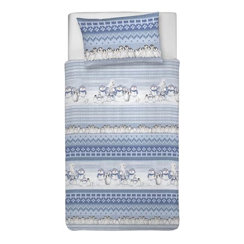 PENSIERI DELICATI Parure de lit Simple 100% Coton, avec Sac 155 x 200 cm et 1 taie d'oreiller 52 x 82 cm, fabriquée en Italie, Housse de Couette Lavable en Machine à 40 °, Motif Hiver Polaire Bleu