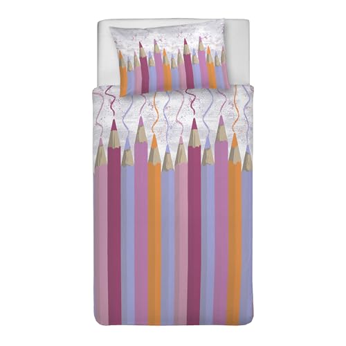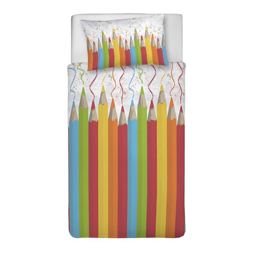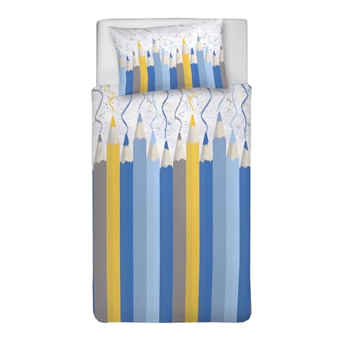 PENSIERI DELICATI Parure de lit 1 Personne 100% Coton, avec Sac 155 x 200 cm et 1 taie d'oreiller 52 x 82 cm, fabriquée en Italie, Housse de Couette Lavable en Machine à 40 °, Fantaisie Crayons