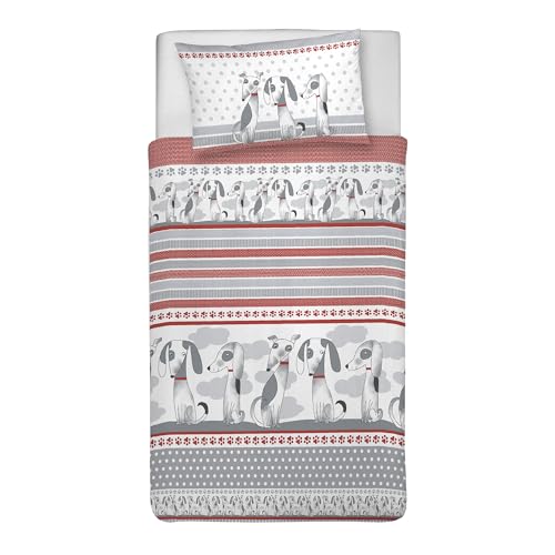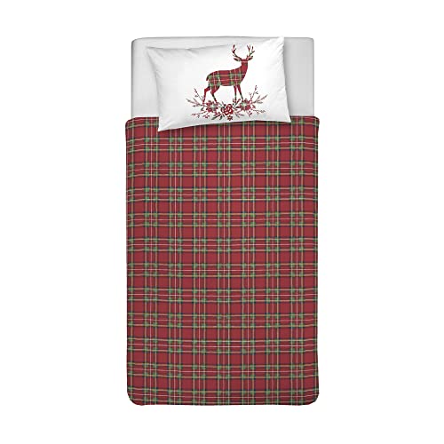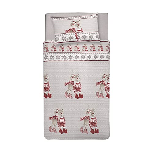 PENSIERI DELICATI Parure de lit 1 Personne 100% Coton, avec Sac 155 x 200 cm et 1 taie d'oreiller 52 x 82 cm, fabriquée en Italie, Housse de Couette Lavable en Machine à 40 °, Motif Renne Rouge