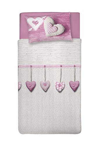 PENSIERI DELICATI Parure de lit Simple 100% Coton, avec Sac 155 x 200 cm et 1 taie d'oreiller 52 x 82 cm, fabriquée en Italie, Housse de Couette Lavable en Machine à 40 °, Motif cœur Suspendu Rose