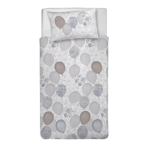 PENSIERI DELICATI Parure de lit Simple 100% Coton, avec Sac 155 x 200 cm et 1 taie d'oreiller 52 x 82 cm, fabriquée en Italie, Housse de Couette Lavable en Machine à 40 °, Motif Ballons Beiges