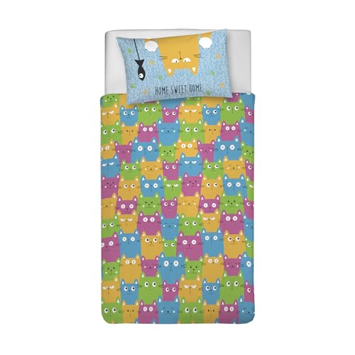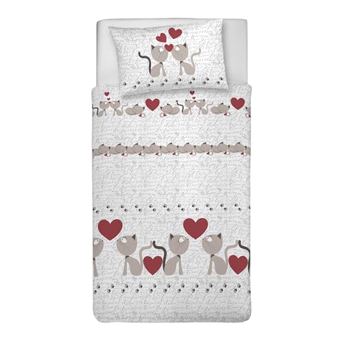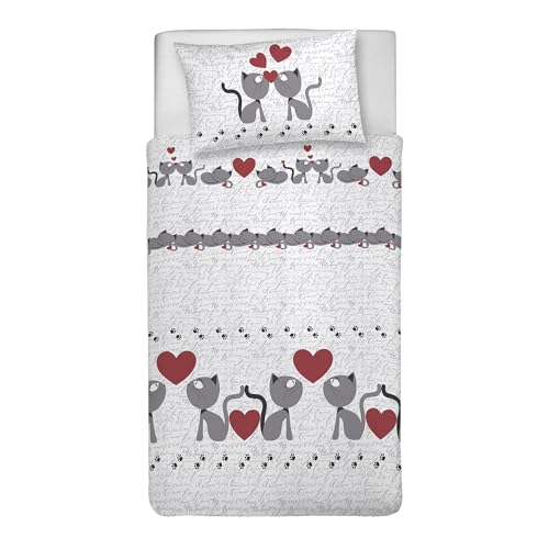 PENSIERI DELICATI Parure de lit Simple 100% Coton, avec Sac 155 x 200 cm et 1 taie d'oreiller 52 x 82 cm, fabriquée en Italie, Housse de Couette Lavable en Machine à 40 °, Fantaisie Happycat