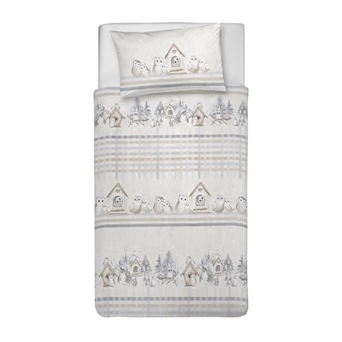 PENSIERI DELICATI Parure de lit Simple 100% Coton, avec Sac 155 x 200 cm et 1 taie d'oreiller 52 x 82 cm, fabriquée en Italie, Housse de Couette Lavable en Machine à 40 °, Fantaisie hiboux Beige