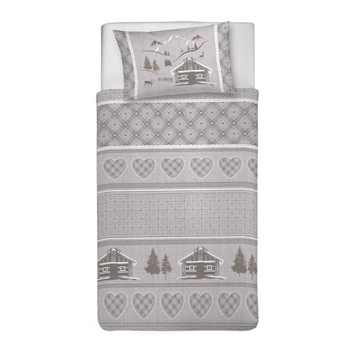 PENSIERI DELICATI Parure de lit Simple 100% Coton, avec Sac 1550 x 200 cm et 1 taie d'oreiller 52 x 82 cm, fabriquée en Italie, Housse de Couette Lavable en Machine à 40 °, Motif Chalet Beige