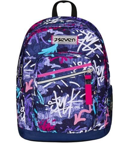 Seven Sac à dos double compartiment New Fit, GraffitiMix, Violet, poche porte-bouteille, Maxi capacité, dossier préformé, sac à dos scolaire et voyage, enfants et adolescents, aubergine, Taglia unica,