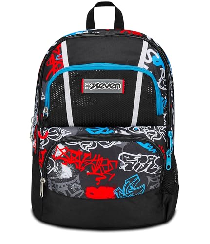 Seven Sac à Dos d'école Adavanced Pockets, Noir Rouge, Demi-Rue, Sac à Dos Double Compartiment, Multi-Poches, avec Poche pour PC, Poche Porte-Bouteille et Organisateur, Sac à Dos Moyen et supérieur,