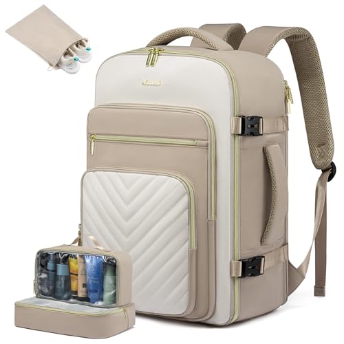 LOVEVOOK Sac à Dos de Voyage Femme, 50L Sac a Dos Bagages Cabine Avion pour Easyjet Ryanair, Imperméable Sac Ordinateur Portable 18 Pouces Valise de Travail Randonnée Affaires, Beige Kaki