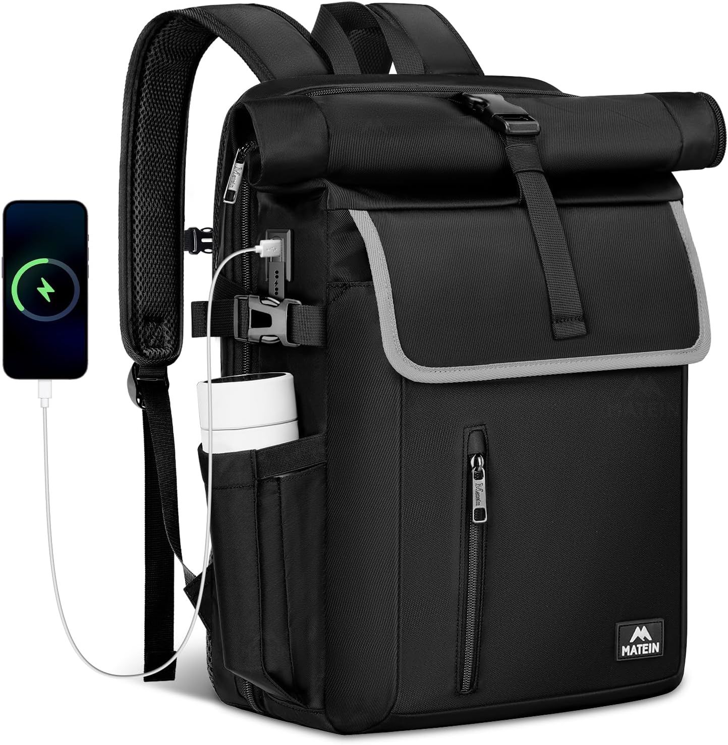 MATEIN Sac Roll-Top Imperméable Extensible, Sac A Dos Antivol Femme pour PC Ordinateur 17 Pouces avec USB Certification TSA, Sacs A Dos Voyage Femme Airtag 30L Travail Homme Le Cyclisme, Noir