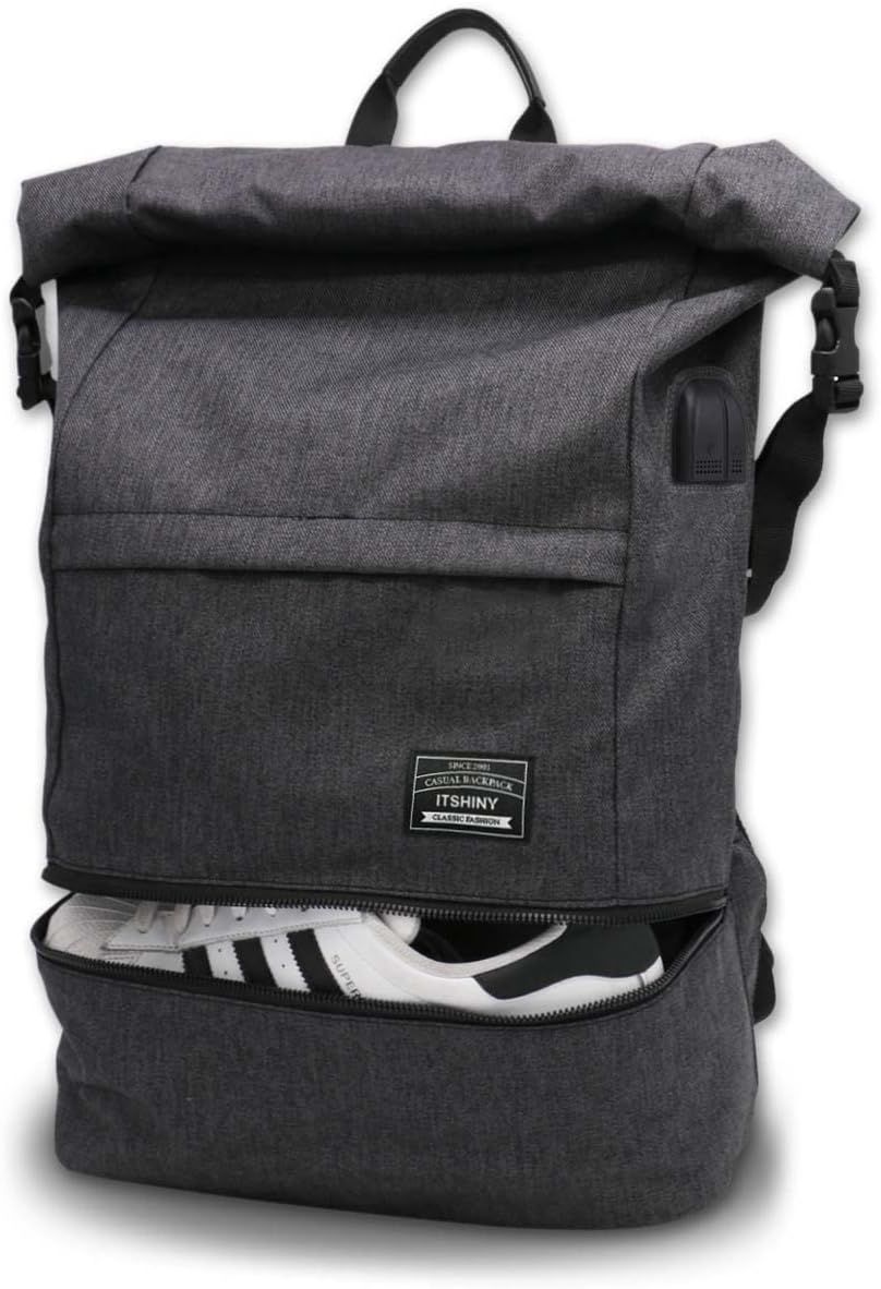ITSHINY Sac à Dos Roll Top Antivol pour Ordinateur Portable 15,6 Pouces - Sac d'École Résistant à l'Eau, Léger, Casual pour Homme et Femme - Gris