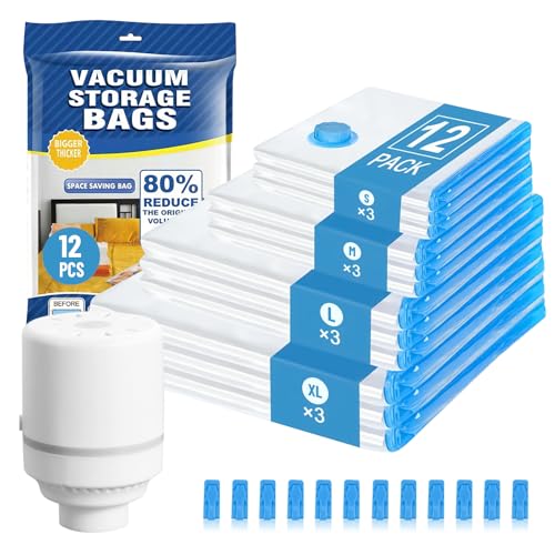 Sac Sous Vide Vetement Aspirateur et Pompe Électrique,12 Pièces Sac de Rangement Sous Vide(3*XL+3*L+3*M+3*S),Epaissi Compression Housse Aspirable Rangement Réutilisable pour Literie,Vêtements,Couettes