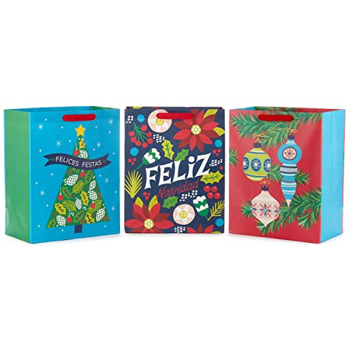 Hallmark VIDA Grand sac cadeau de Noël 33 cm (3 sacs cadeaux espagnols : Feliz Navidad, Felices Festas, arbre, fleurs, ornements colorés)