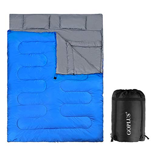 GOPLUS Sac de Couchage Imperméable pour 2 Personnes Détachable avec 2 Oreillers-Un Sac Livré Facilite Le Rangement et Le Transport-Camping,Randonnée-Bleu 220x150cm (Bleu)