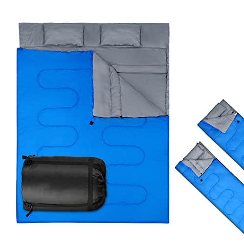 SOARS Sac de couchage double pour 2 personnes, avec 2 oreillers et sac de transport, imperméable, pour adulte, pour l'extérieur, le camping, la randonnée, les voyages (bleu)
