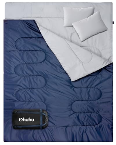 Sac de Couchage Adulte, Ohuhu Sac de Couchage 2 Personnes Sac de Couchage Rectangulaire Camping avec 2 Oreillers pour Tentes Camion Randonnée, 220 * 150cm 2.75kg